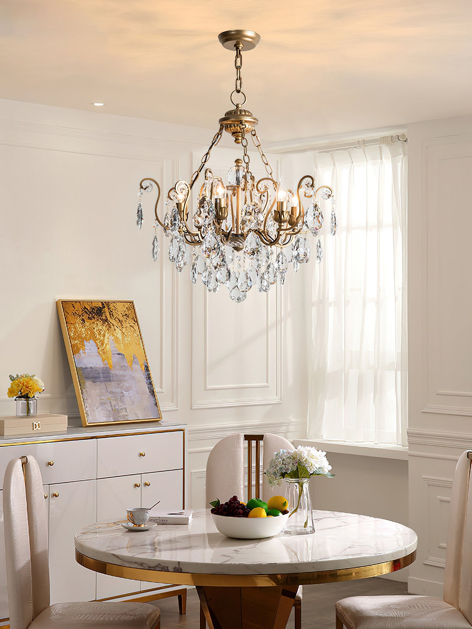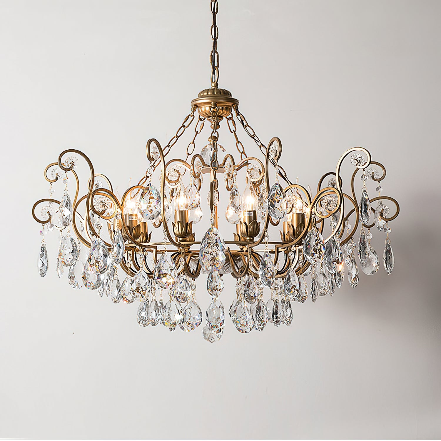 The Aeliana Crystal Chandelier is a breathtaking masterpiece that redefines classical opulence for the modern luxury home. Ornate. scrolling metal flourishes spiral outward from the central ring. each draped with high-clarity crystal pendants that maximize light refraction and create a multidimensional glow.