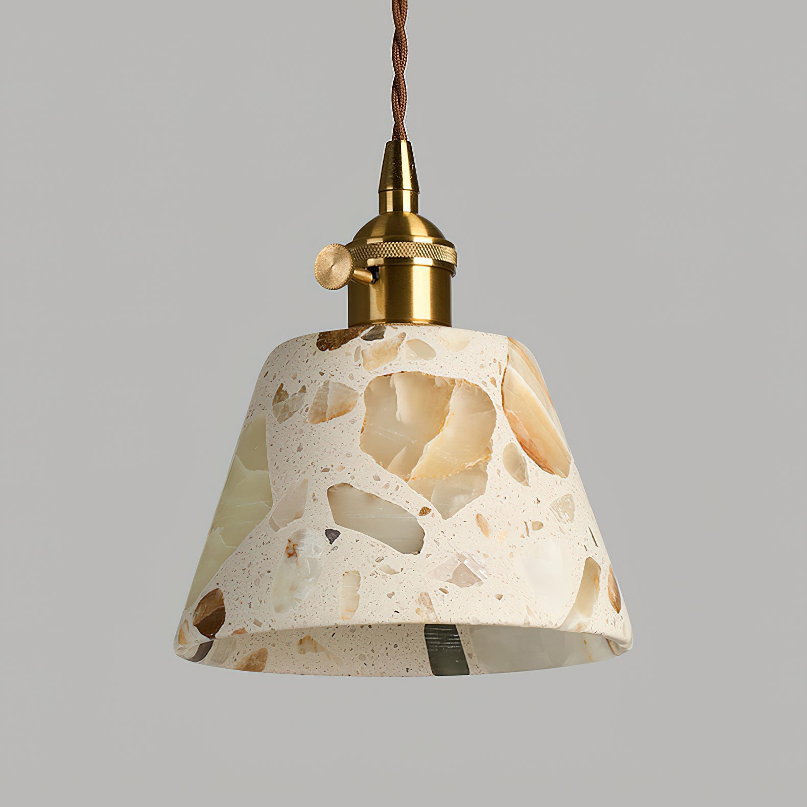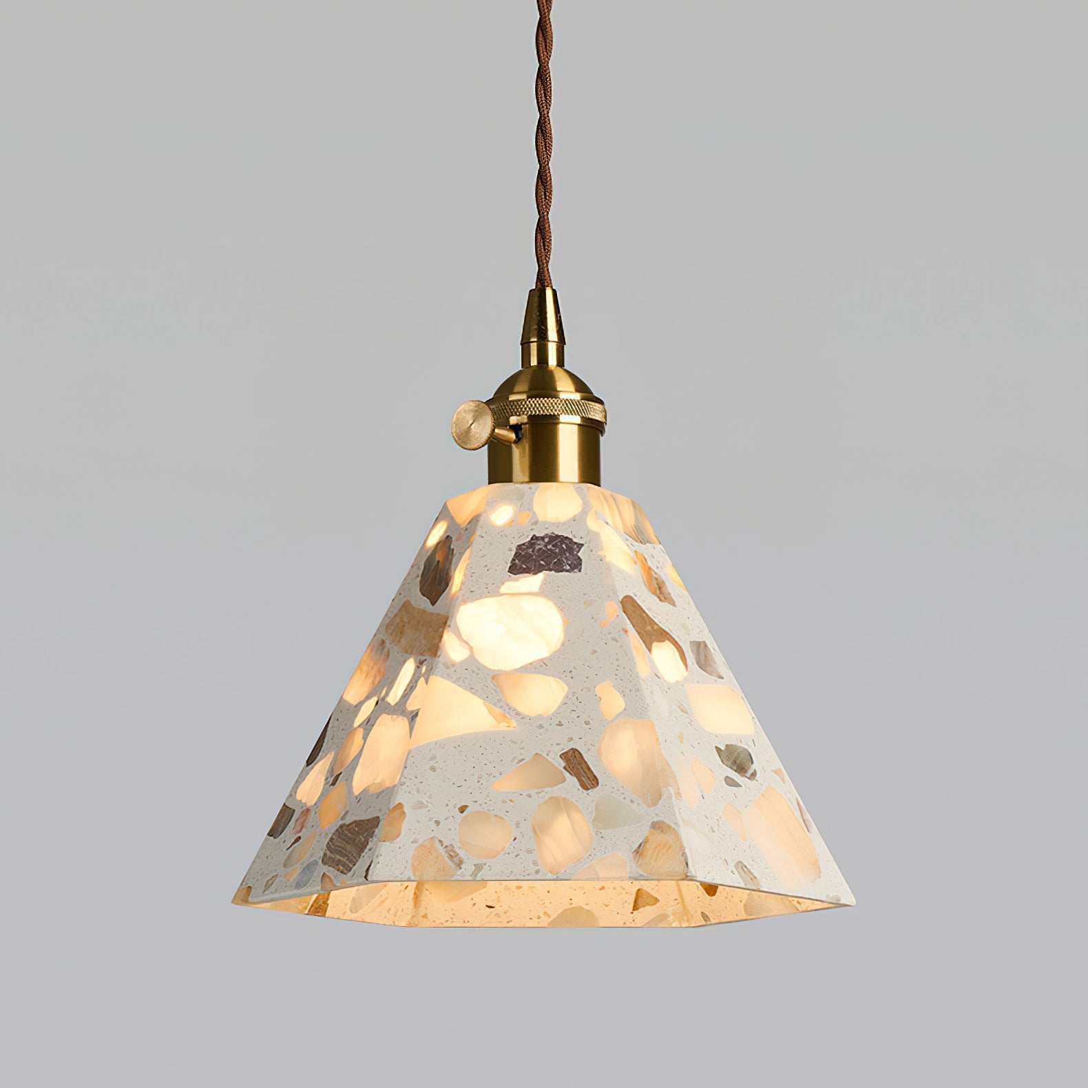 Illuminate your space with the organic beauty of the Alvaro Pendant Lamp. The centerpiece of this fixture is its stunning conical shade. crafted from translucent stone. Featuring large. irregular fragments of quartz-toned aggregate. the shade glows warmly when lit. revealing a unique. terrazzo-like mosaic that turns light into art.