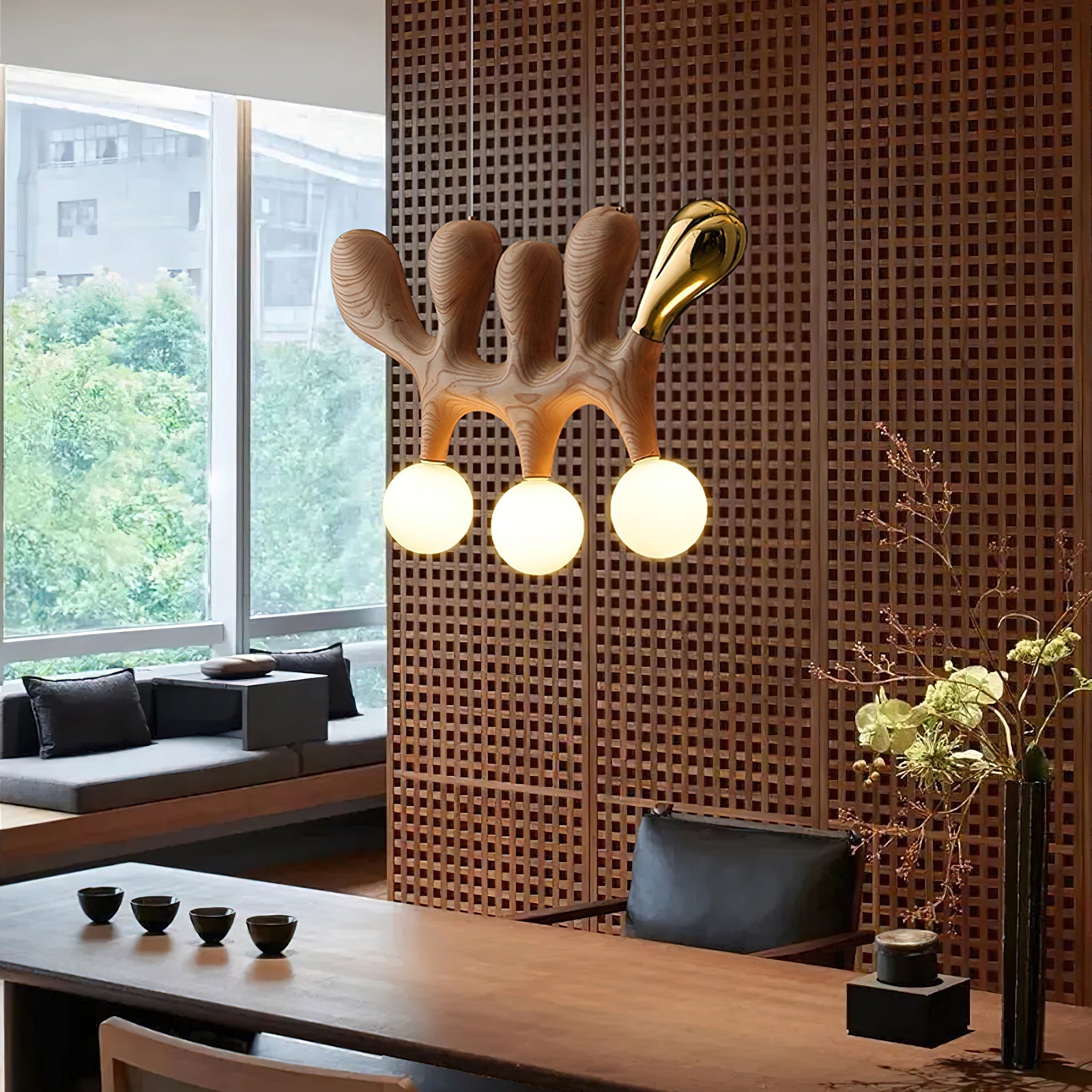 The Antenna Pendant Lamp by dekorfine is a striking fusion of sculptural form and functional lighting. Crafted from a harmonious blend of wood. metal. and glass. this pendant features a playful. organic silhouette that evokes both nature and modern art. The smooth wooden body extends like abstract antennae. cradling three glass globes that emit a warm. ambient glow. A polished metallic accent adds a bold contrast. elevating the piece with a touch of refinement.