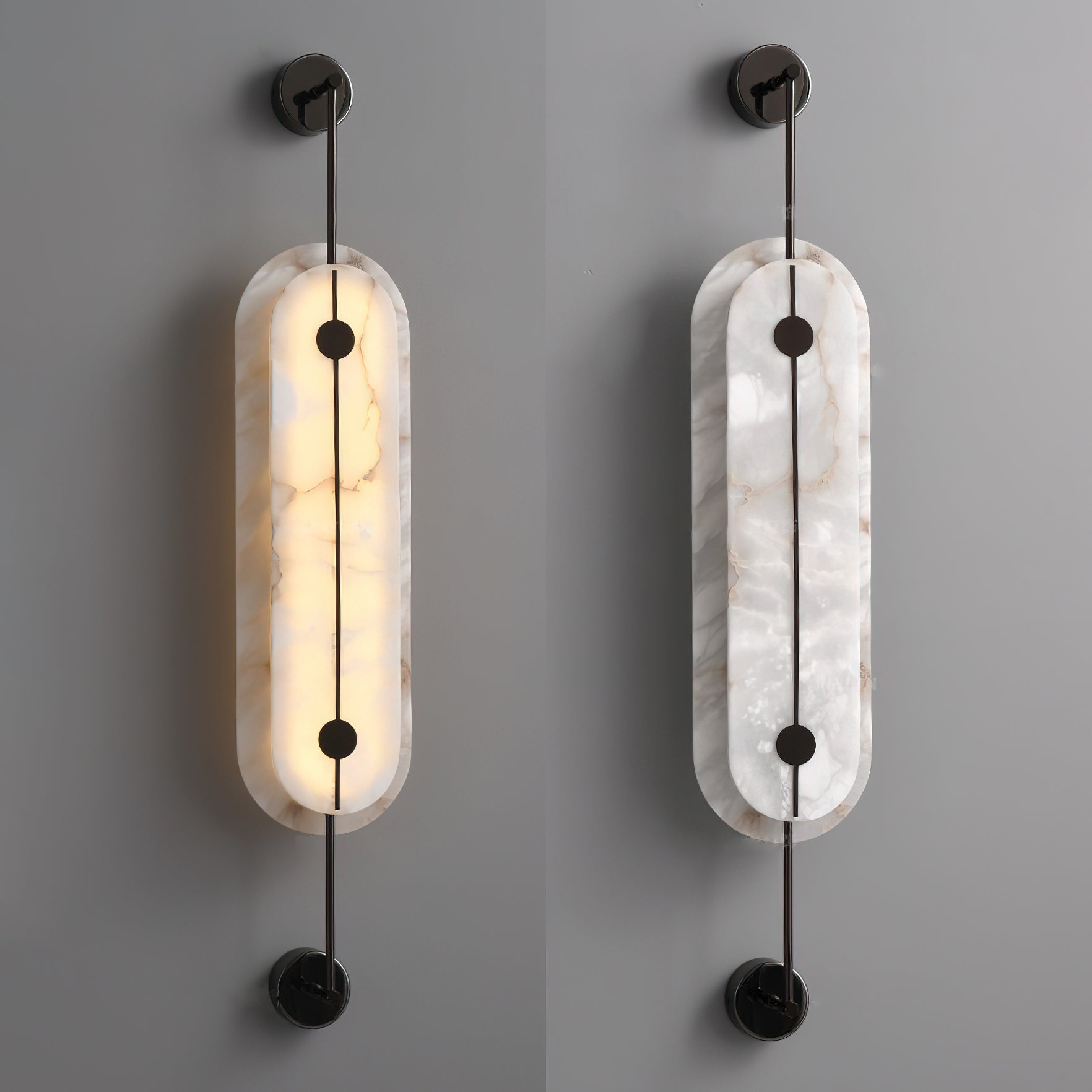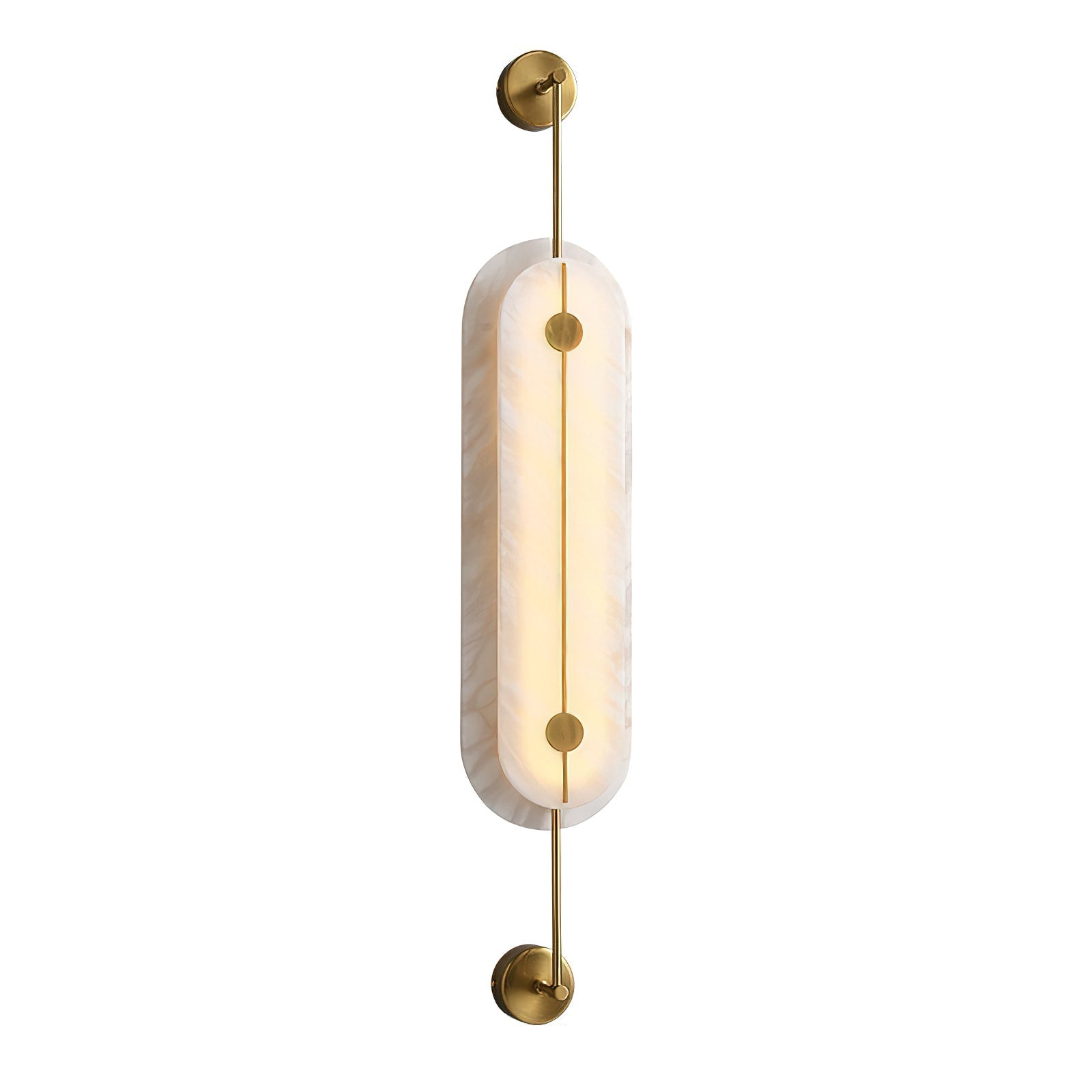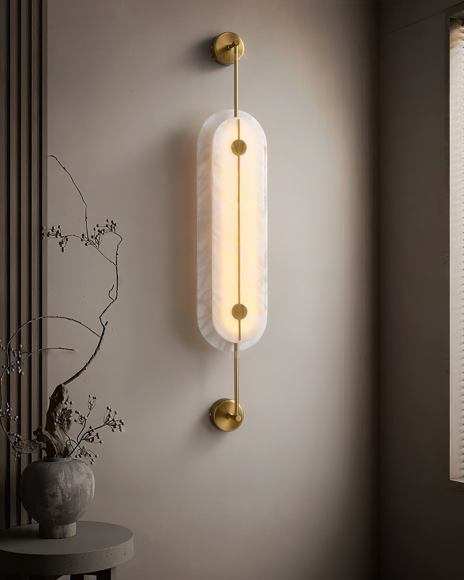 Redefine your wall space with the Brace Alabaster Wall Lamp . a fixture that perfectly marries architectural precision with organic luxury. Its name is derived from its defining feature: a slender. brass-finished iron rod that securely 'braces' a magnificent. pill-shaped slab of natural alabaster