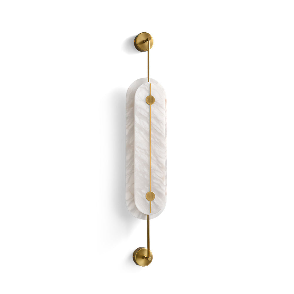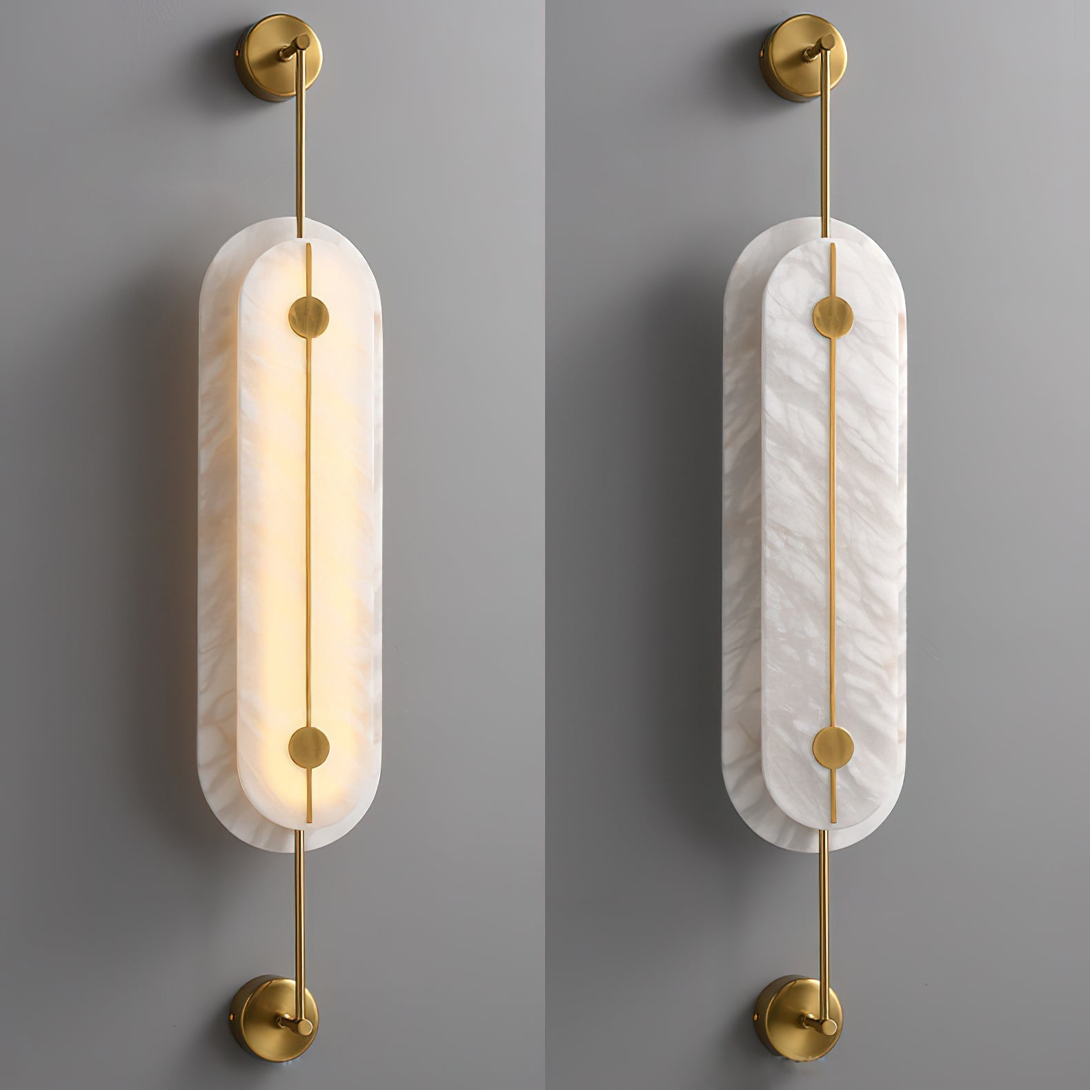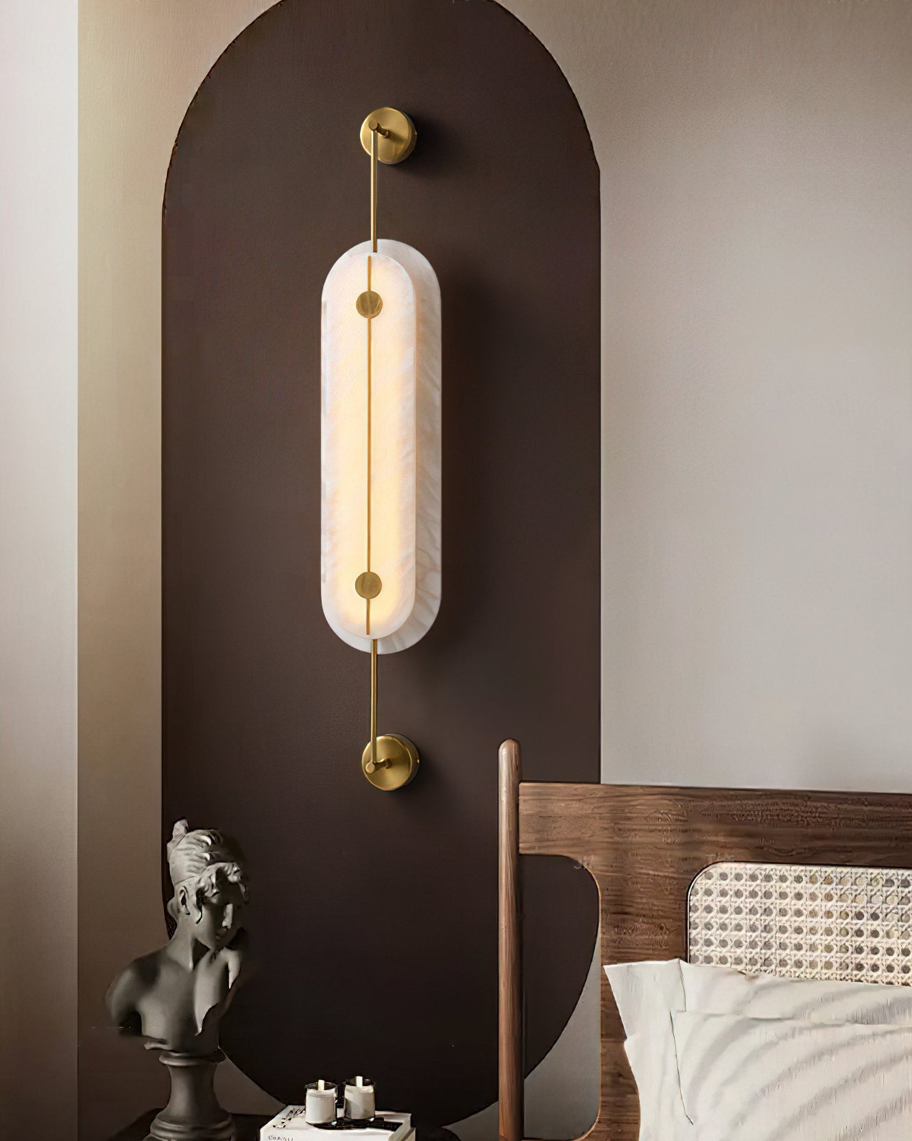 Redefine your wall space with the Brace Alabaster Wall Lamp . a fixture that perfectly marries architectural precision with organic luxury. Its name is derived from its defining feature: a slender. brass-finished iron rod that securely 'braces' a magnificent. pill-shaped slab of natural alabaster