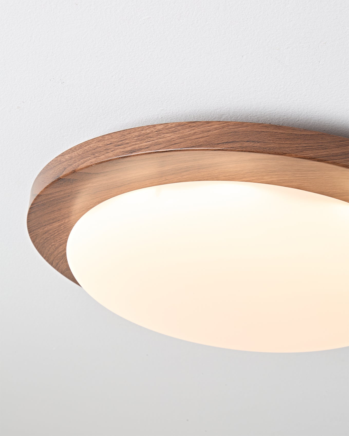 This warm border frames a large. domed white diffuser that emits a soft. even glow. perfect for creating a calming ambiance in bedrooms. living rooms. or hallways.
