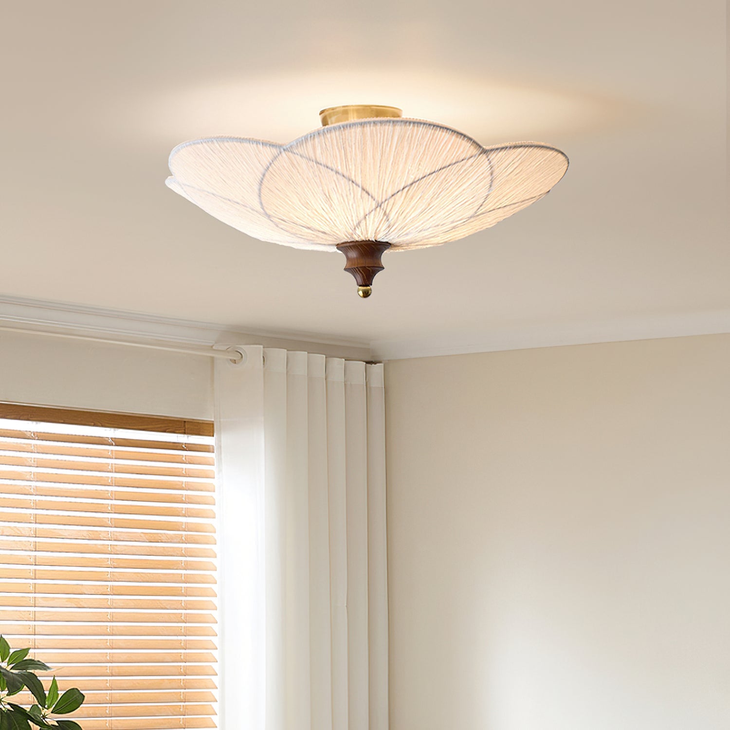 The Doral Ceiling Light from dekorfine captures the grace of botanical form in a refined lighting statement. Crafted from a mix of metal. wood. and pleated fabric. its petal-like shade unfolds softly to create a delicate yet sculptural silhouette. The natural wood detail at the base adds warmth. while the brass-toned accents bring a touch of vintage elegance.