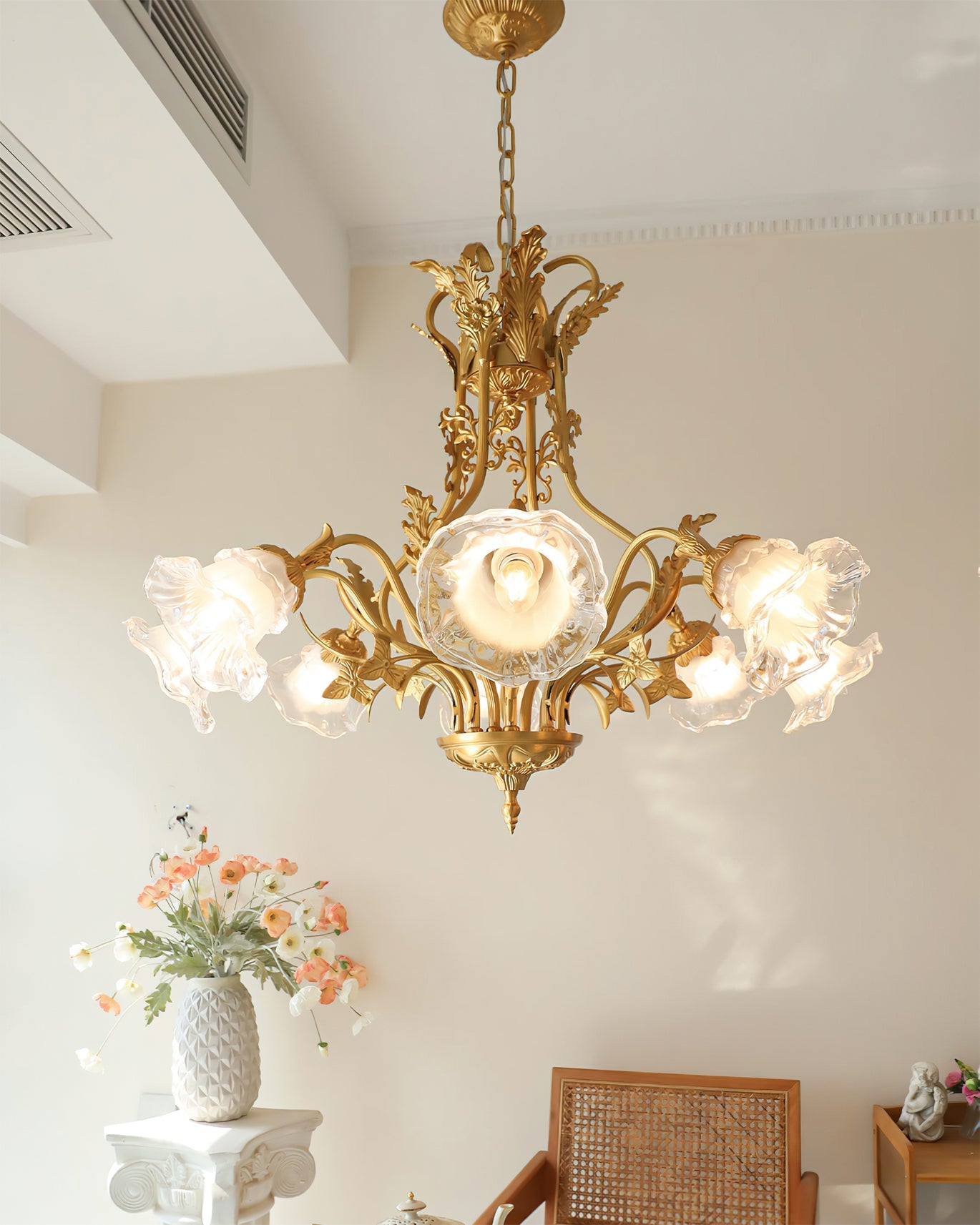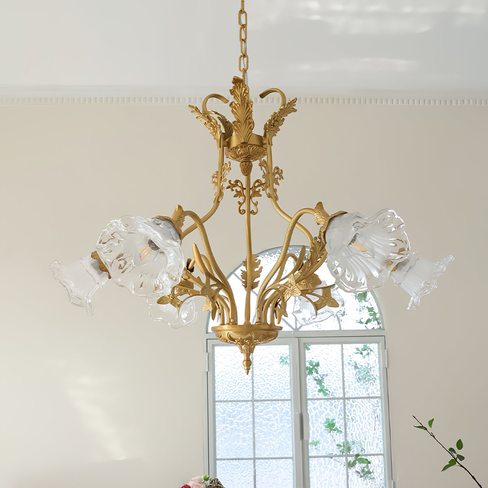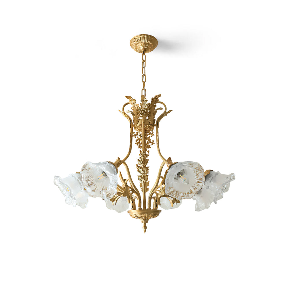 The Dore Flower Chandelier Brass. Glass from dekorfine is a masterpiece of elegance and craftsmanship. Featuring a radiant brass frame adorned with intricate floral motifs. it beautifully complements the delicate glass shades shaped like blooming flowers. This chandelier brings a sense of timeless romance and sophistication. making it a perfect centerpiece for dining rooms. living spaces. or grand entryways