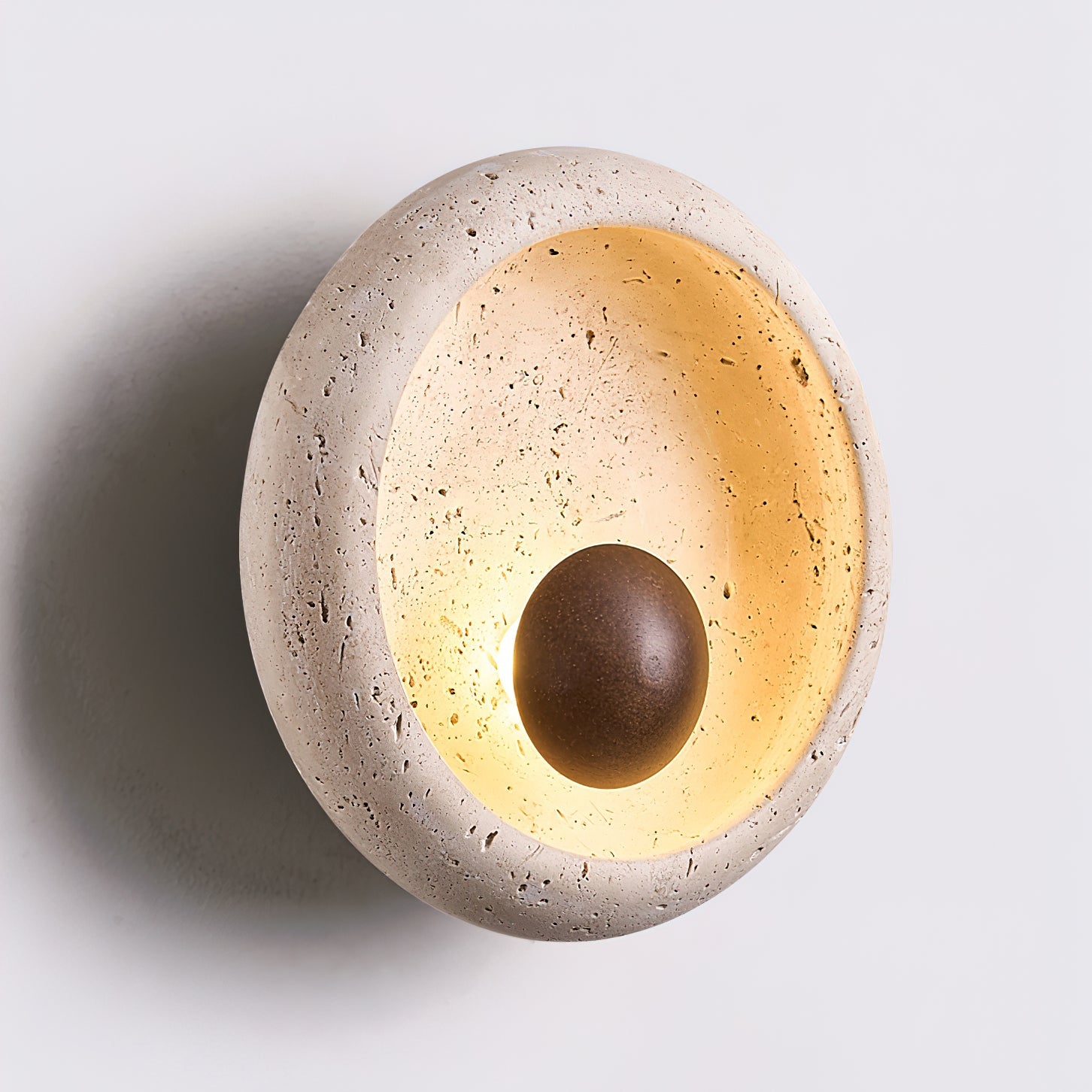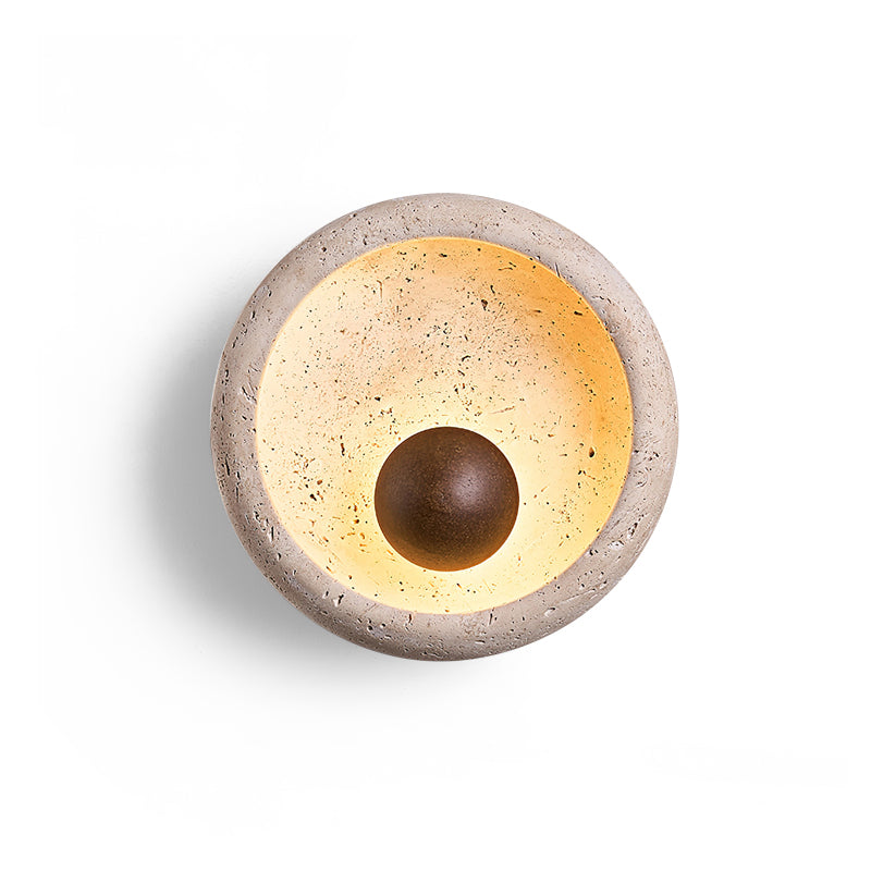 The Eala Travertine Wall Lamp by dekorfine brings sculptural warmth and subtle sophistication to any interior. Carved from natural yellow travertine with its distinctive texture and mineral flecks. the circular form cradles a contrasting wooden sphere. creating a captivating interplay of material and shadow. This unique wall lamp emits a soft. ambient glow that enhances hallways. bedrooms. or living spaces with an earthy elegance.