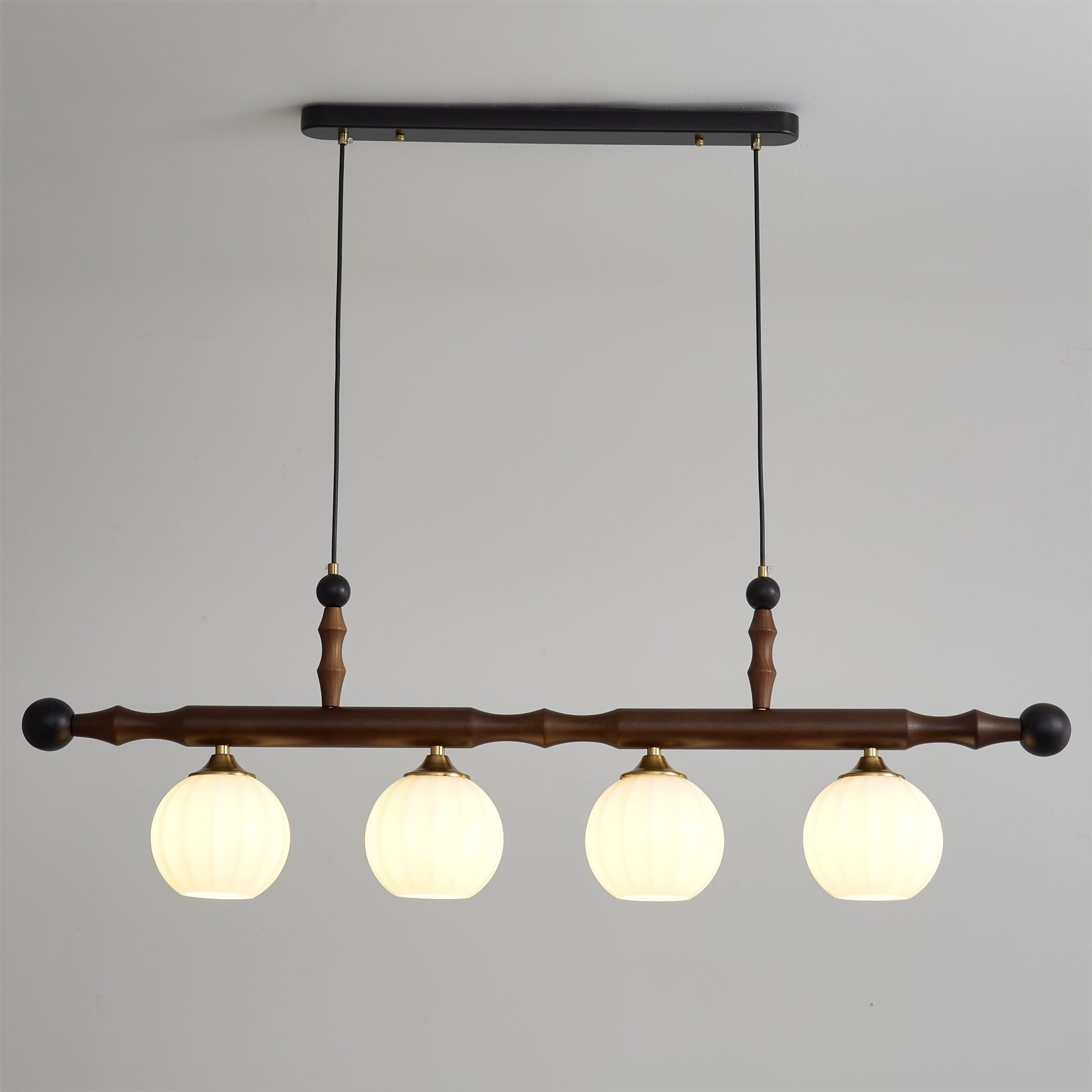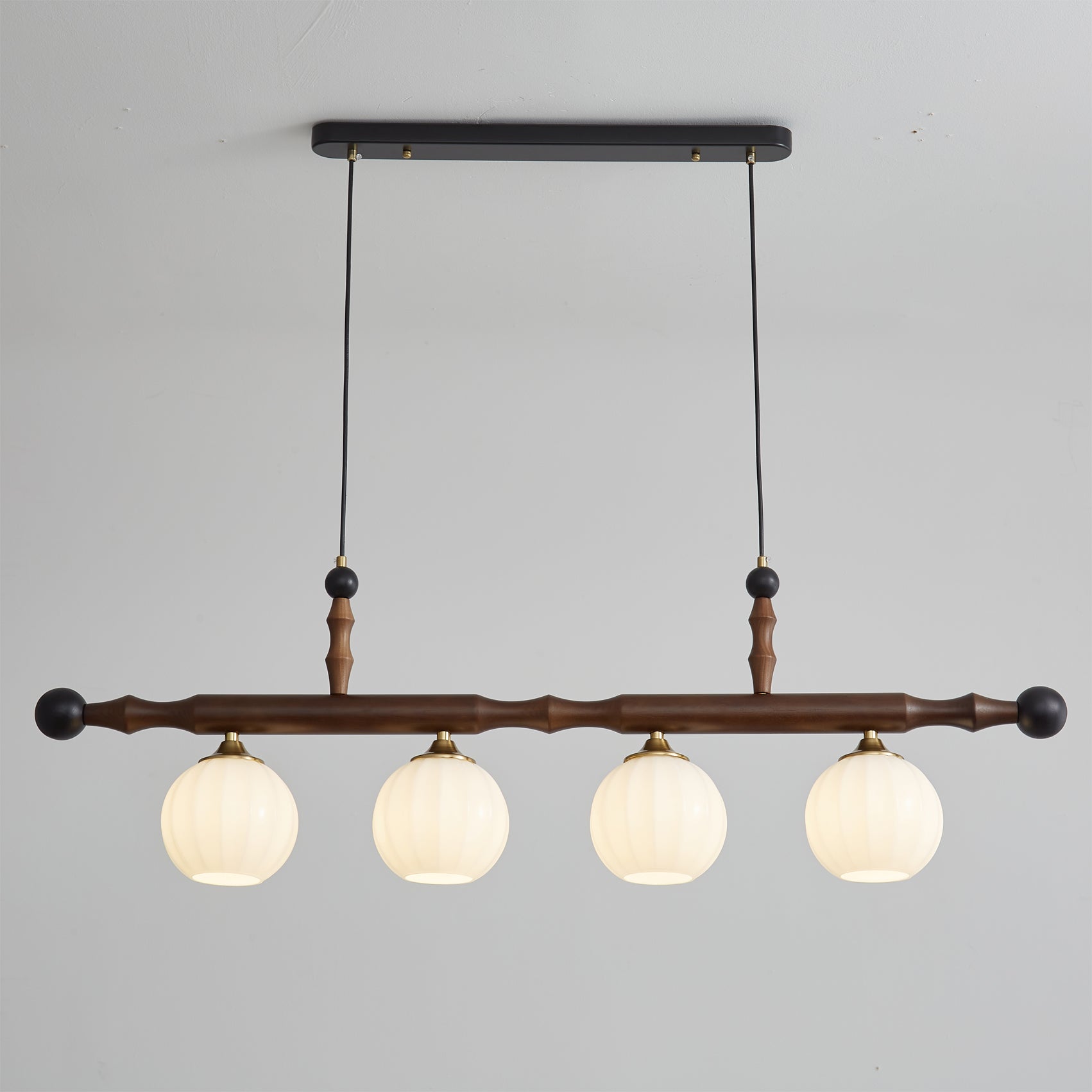 The Elisha Wood Chandelier by dekorfine is a bold yet refined statement piece that fuses natural elegance with vintage charm. Featuring a sculptural solid wood beam adorned with fluted glass globes and gold accents. this chandelier balances traditional craftsmanship with a playful silhouette. The round opal glass shades emit a warm. diffused light. making it ideal for dining tables. kitchen islands. or creative workspaces.