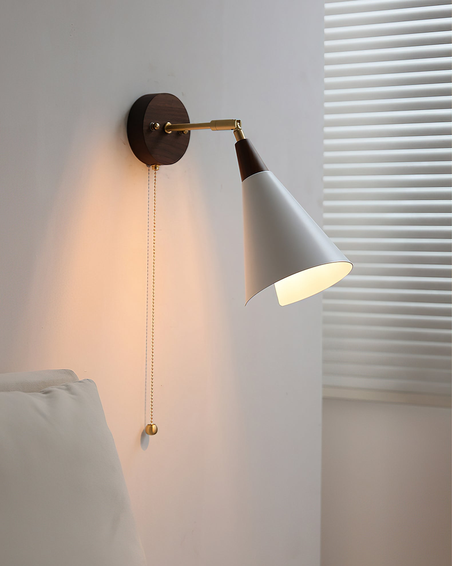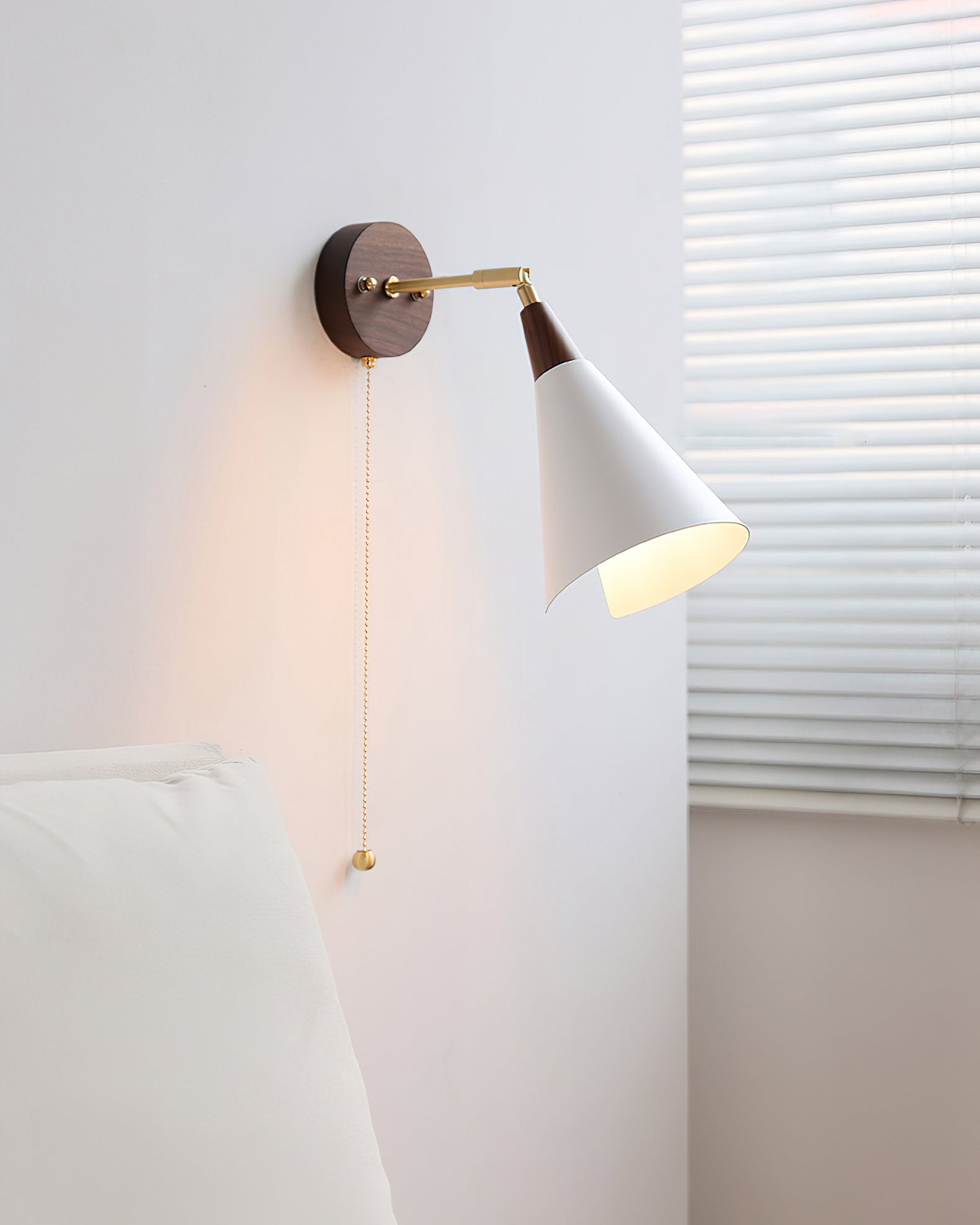 Elevate your interior with the Fleka Wall Lamp. a fixture that beautifully marries Mid-Century Modern aesthetics with Scandinavian simplicity. This wall sconce features a striking material palette. combining a rich. dark walnut-finished wooden base with a sleek brass arm for a look that is both warm and sophisticated.