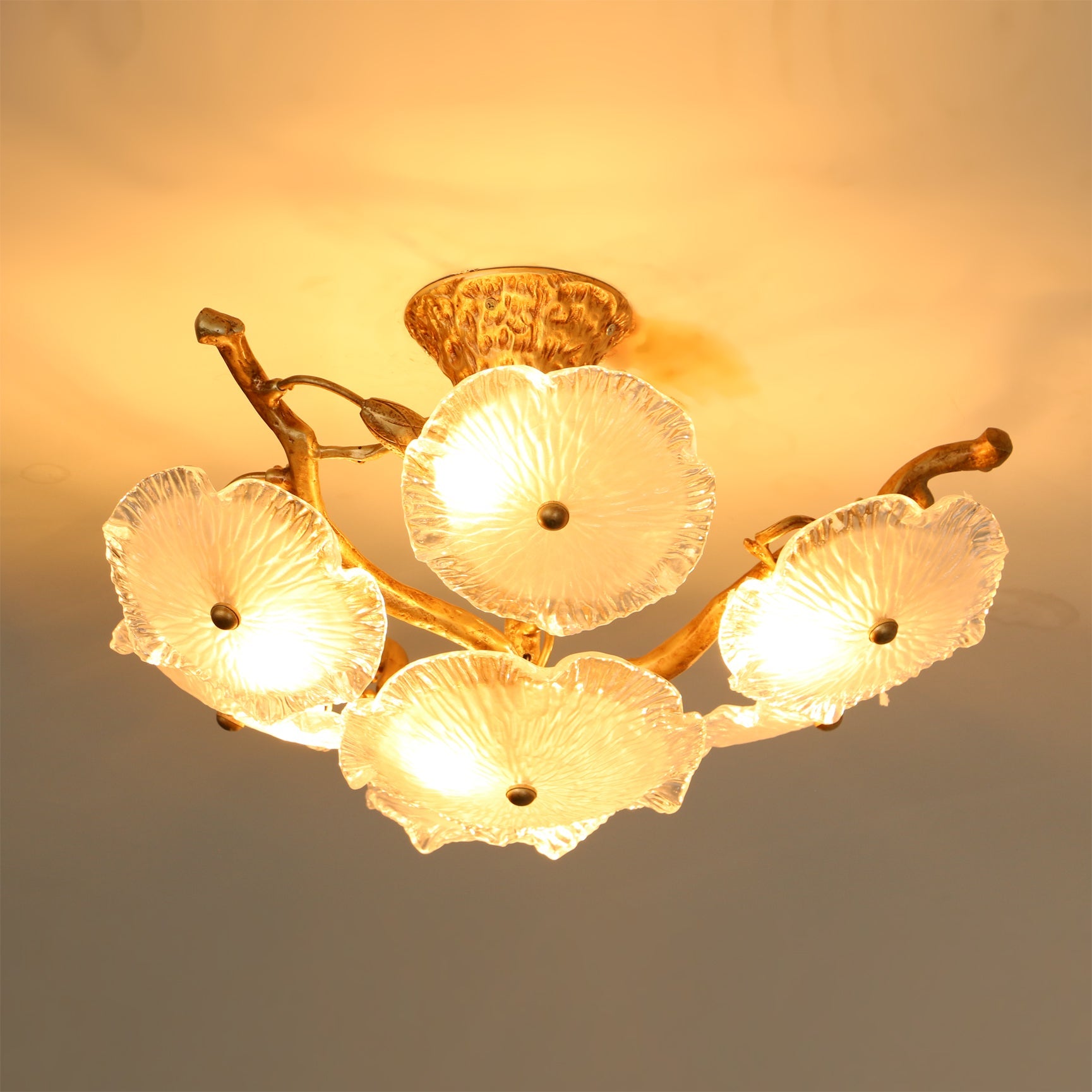 Evoke the serenity of nature with the Kamal Ceiling Lamp. Inspired by the delicate structure of blooming lotuses. this flush-mount fixture features a sculptural brass frame with an antiqued gold finish. Each 'petal' is crafted from hand-blown textured glass. meticulously designed to diffuse light with a soft. ethereal glow.