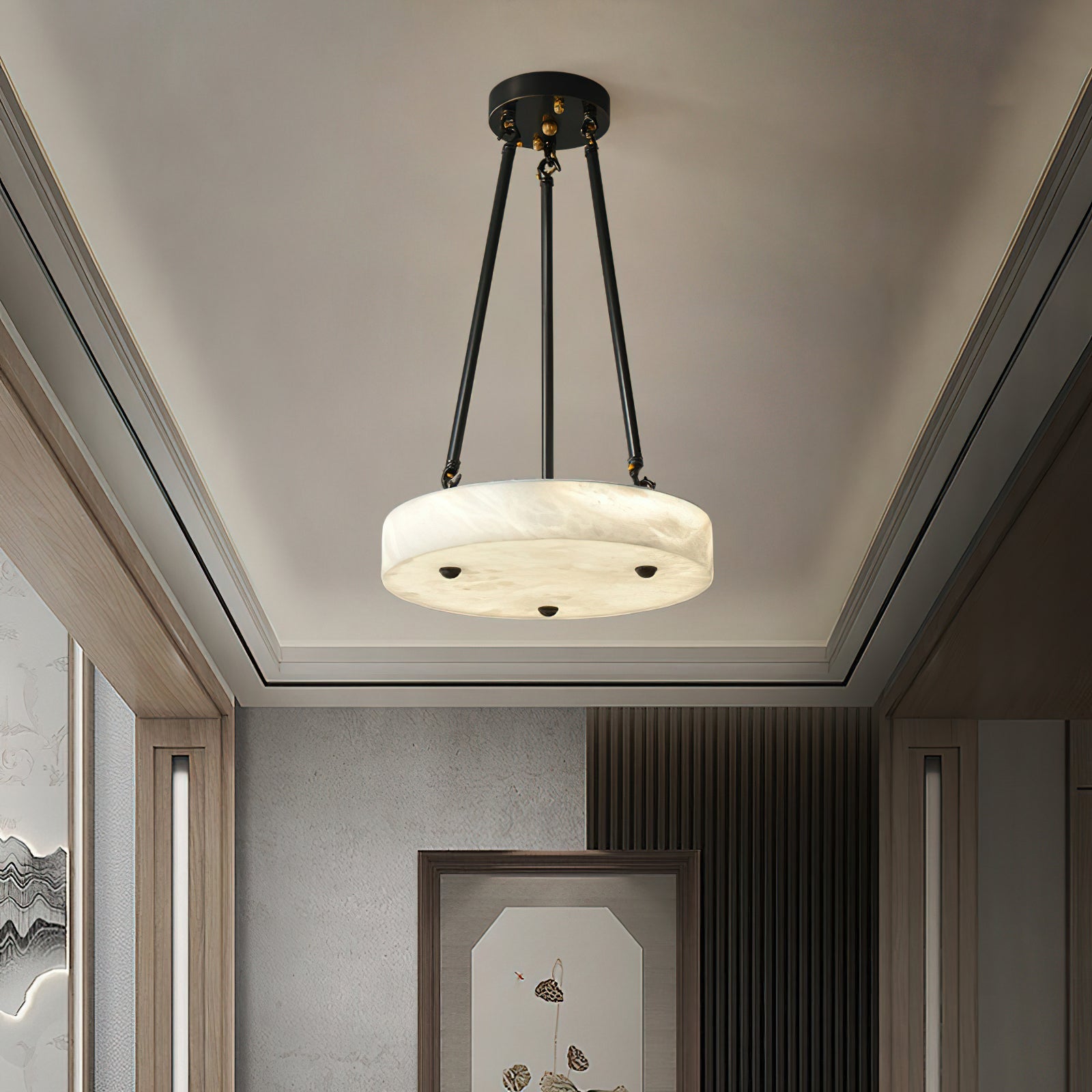 Command attention with the Kayme Alabaster Pendant Lamp. a fixture that perfectly balances visual weight with ethereal light. This striking pendant features a substantial. drum-style shade carved from solid alabaster. suspended by a tripod of darkened brass rods.