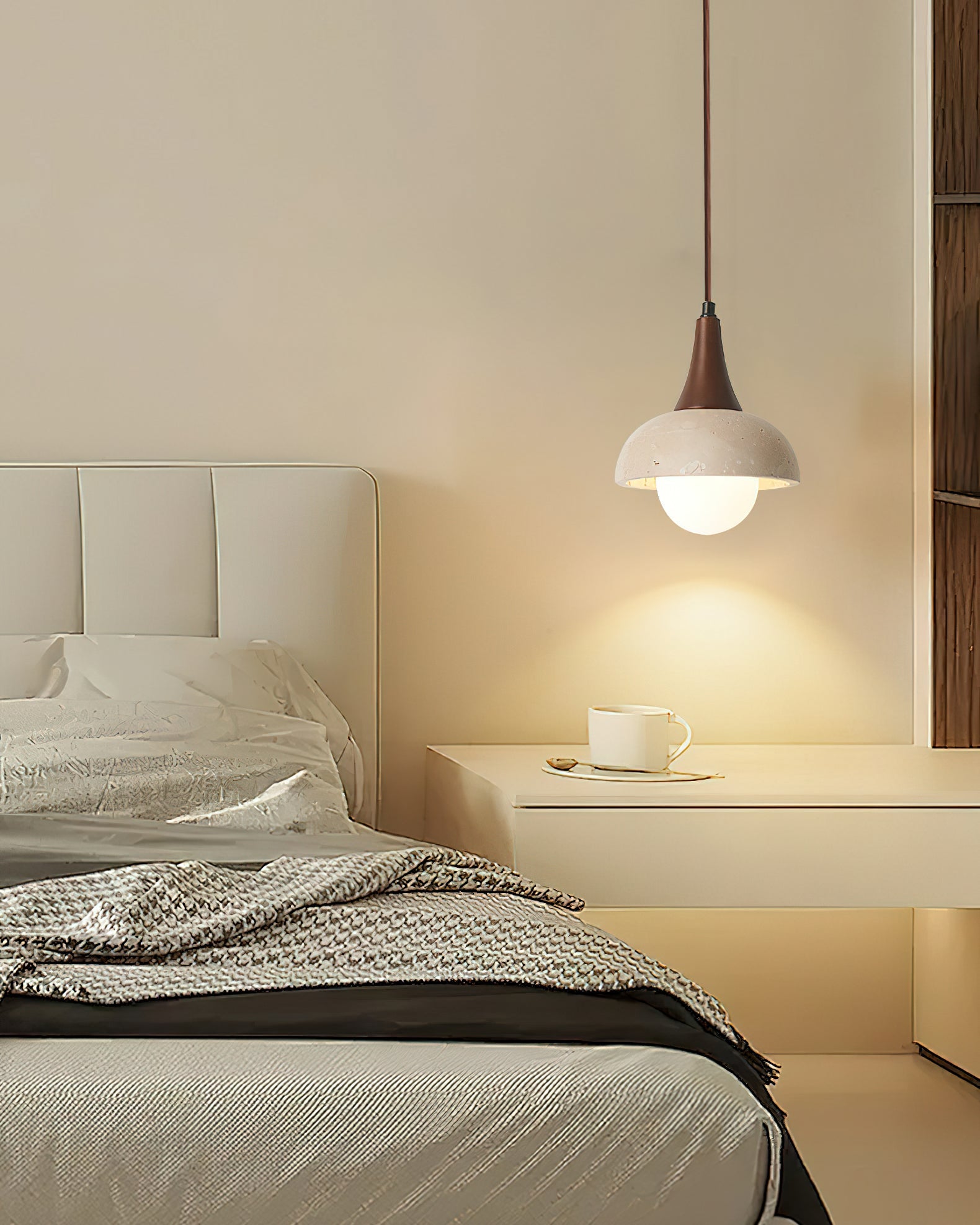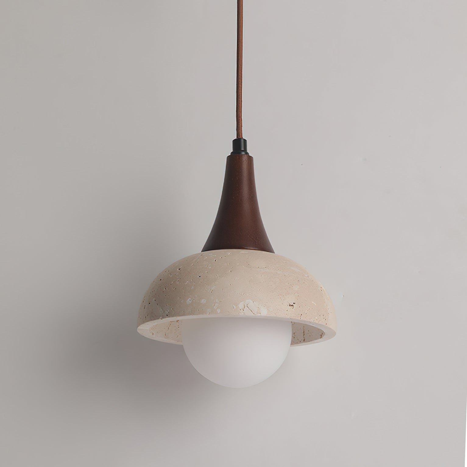 he Kenroy Pendant Light combines the raw beauty of stone with the refinement of dark wood. The fixture pairs a porous Travertine shade with a sculpted wooden top housing. creating a striking visual balance between light and dark materials.