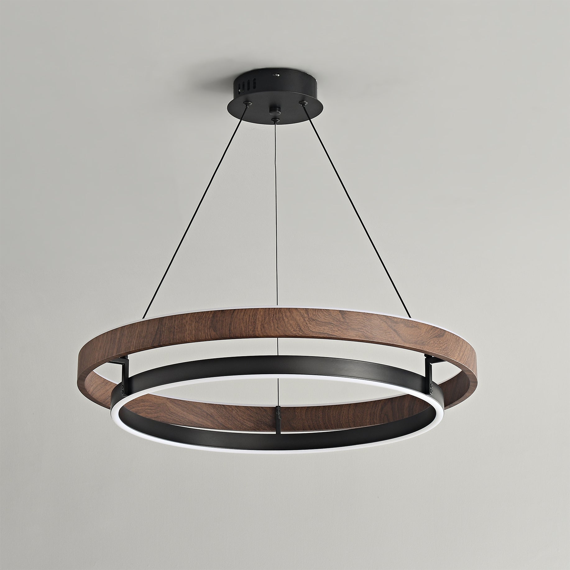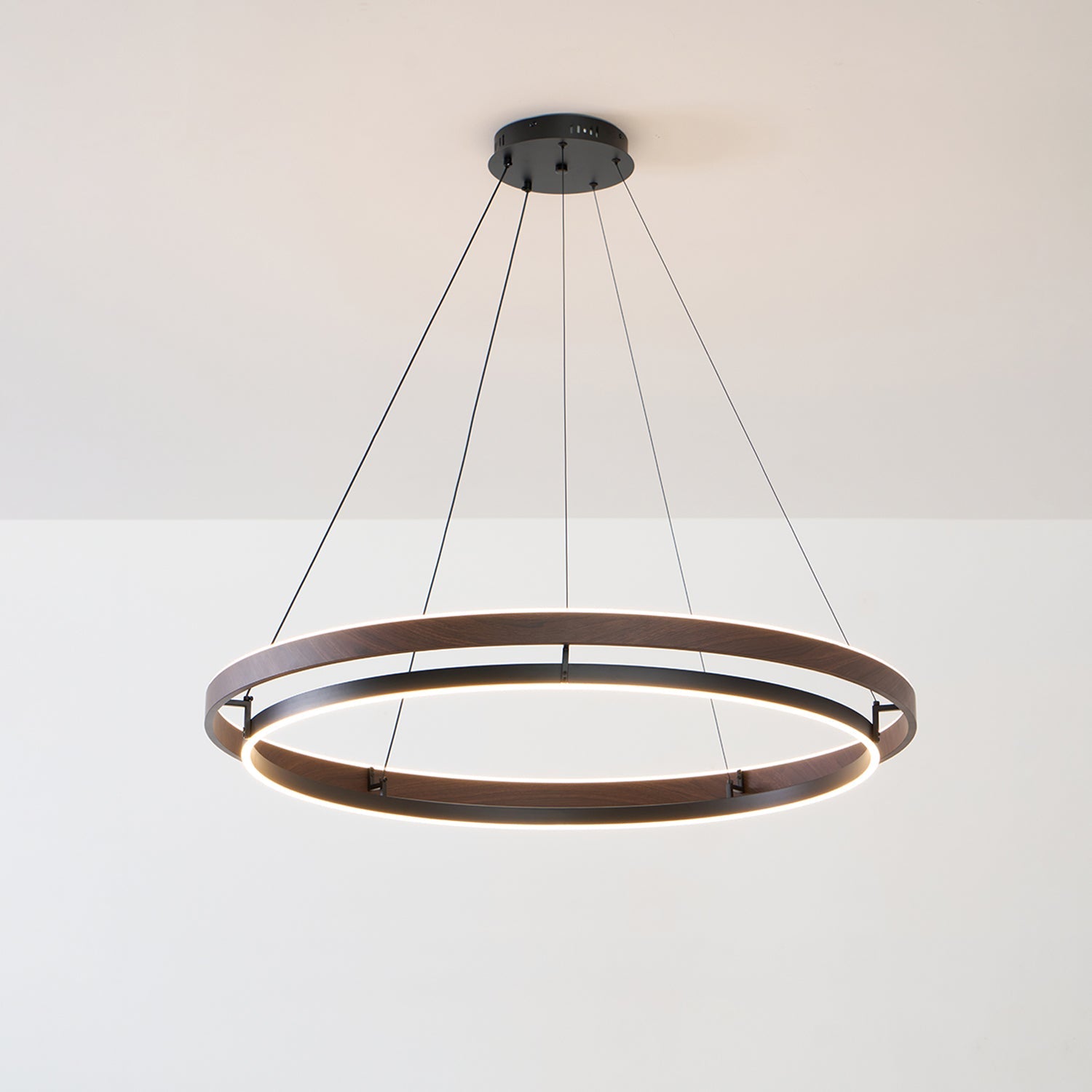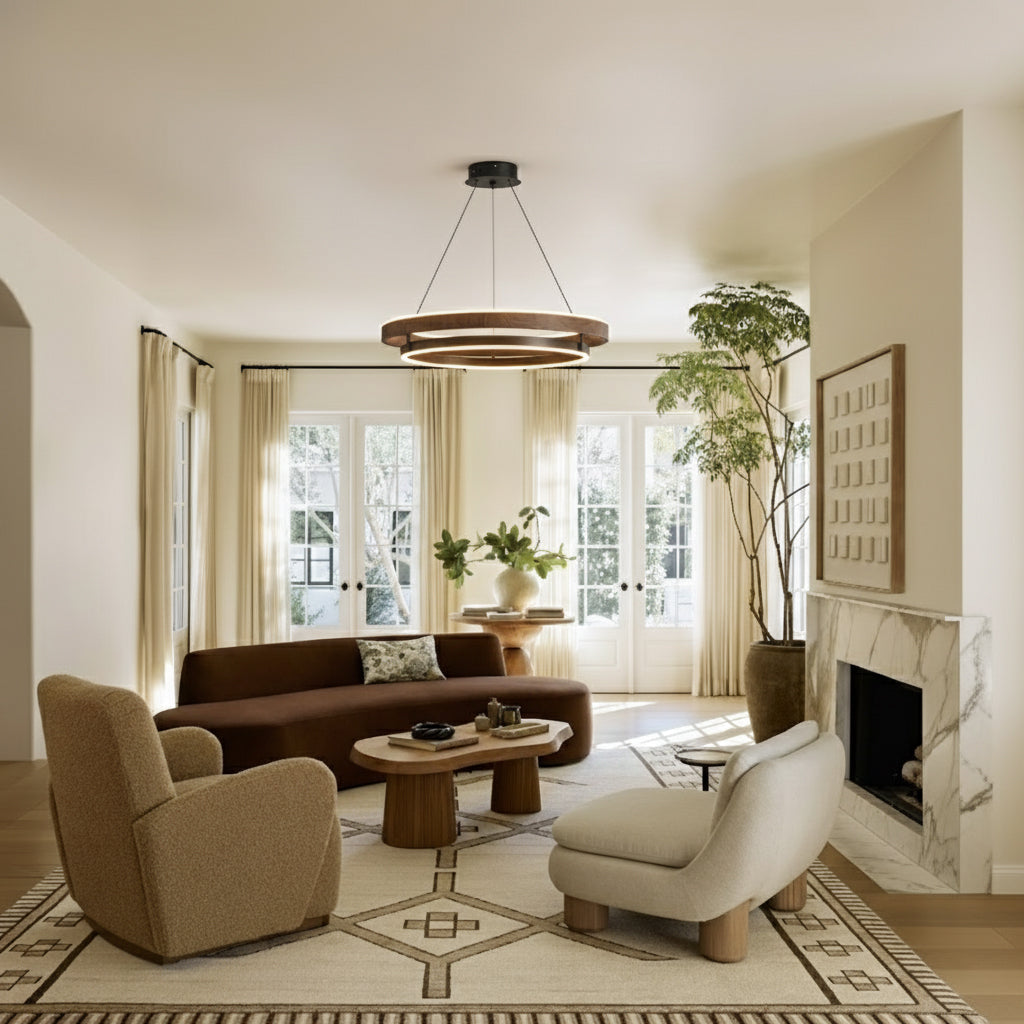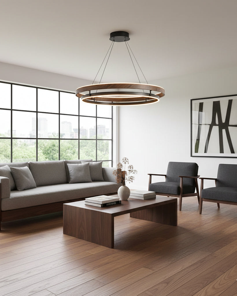 The Niseko Chandelier by dekorfine brings sculptural elegance to modern interiors with its sleek double-ring design and warm LED illumination. Crafted from durable metal with a rich wood-effect finish. this fixture creates a floating halo of ambient light€”perfect for dining rooms. living areas. or open loft spaces.