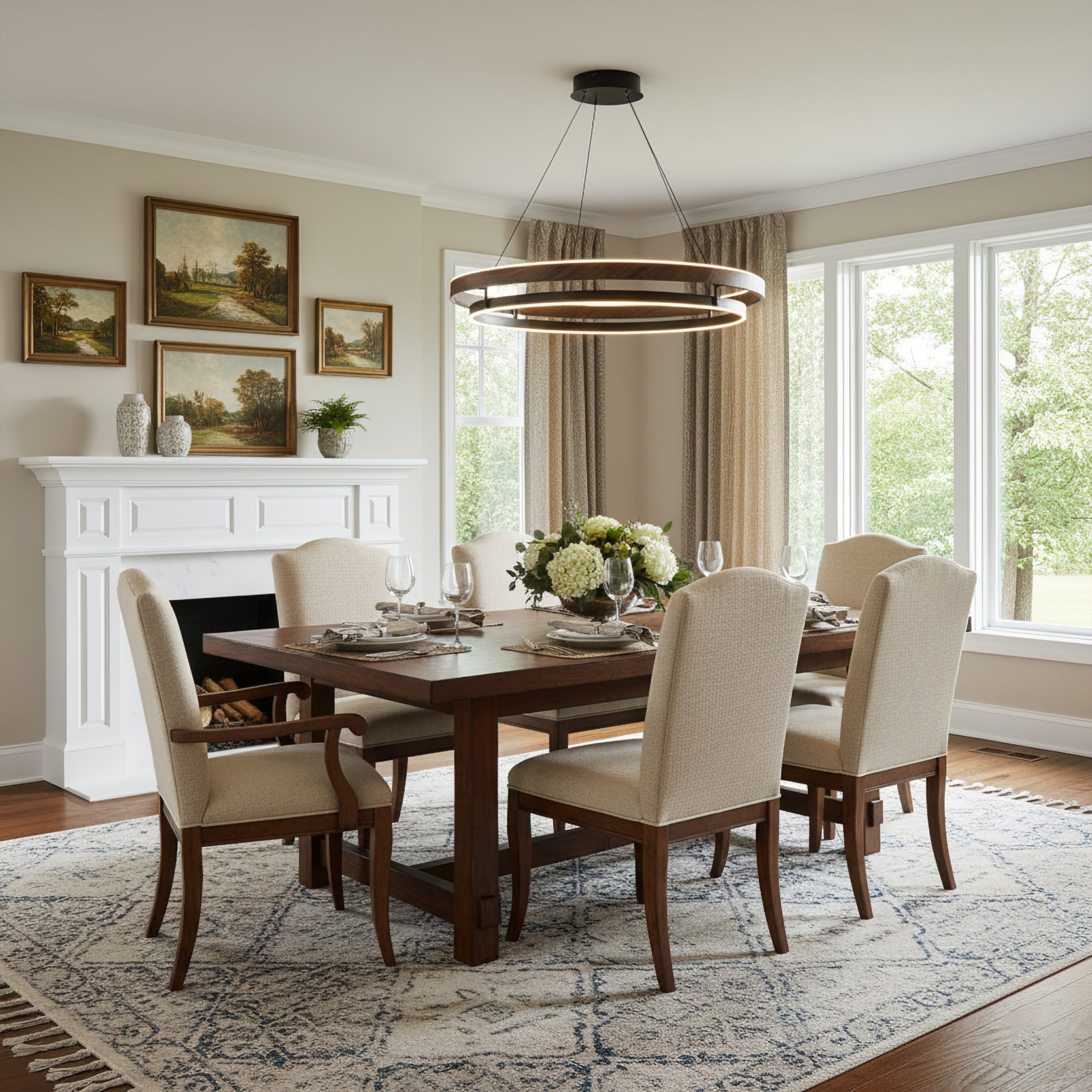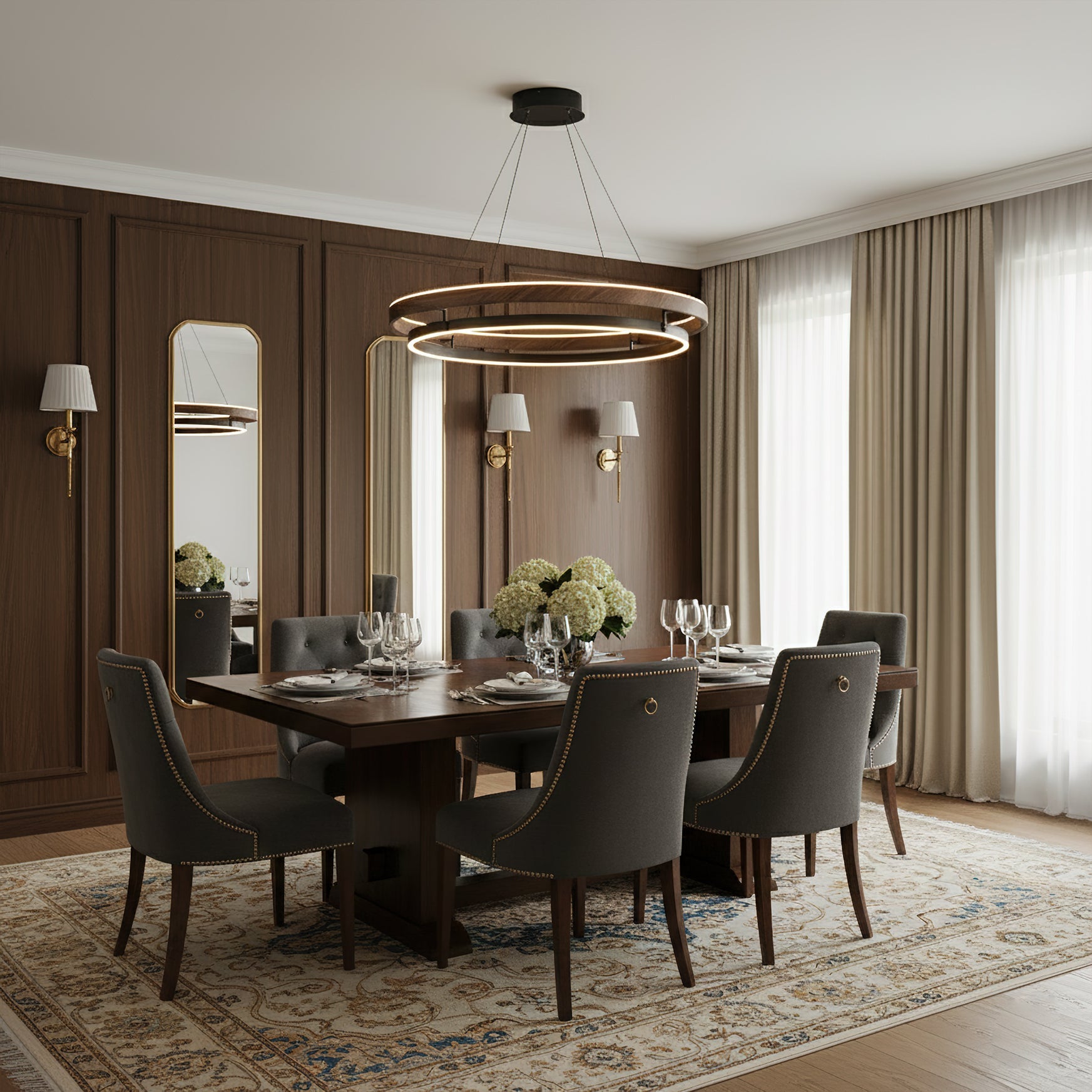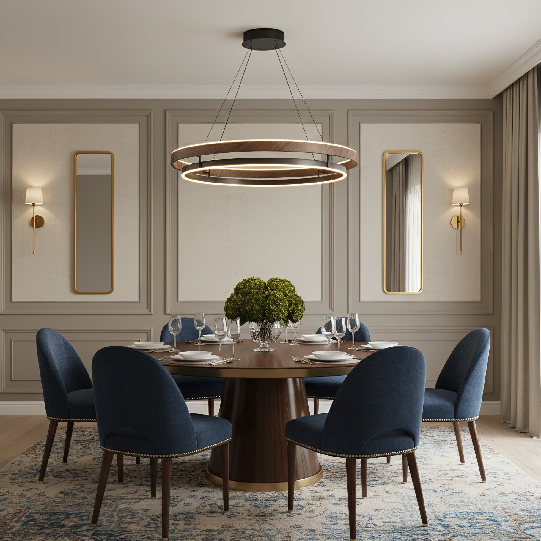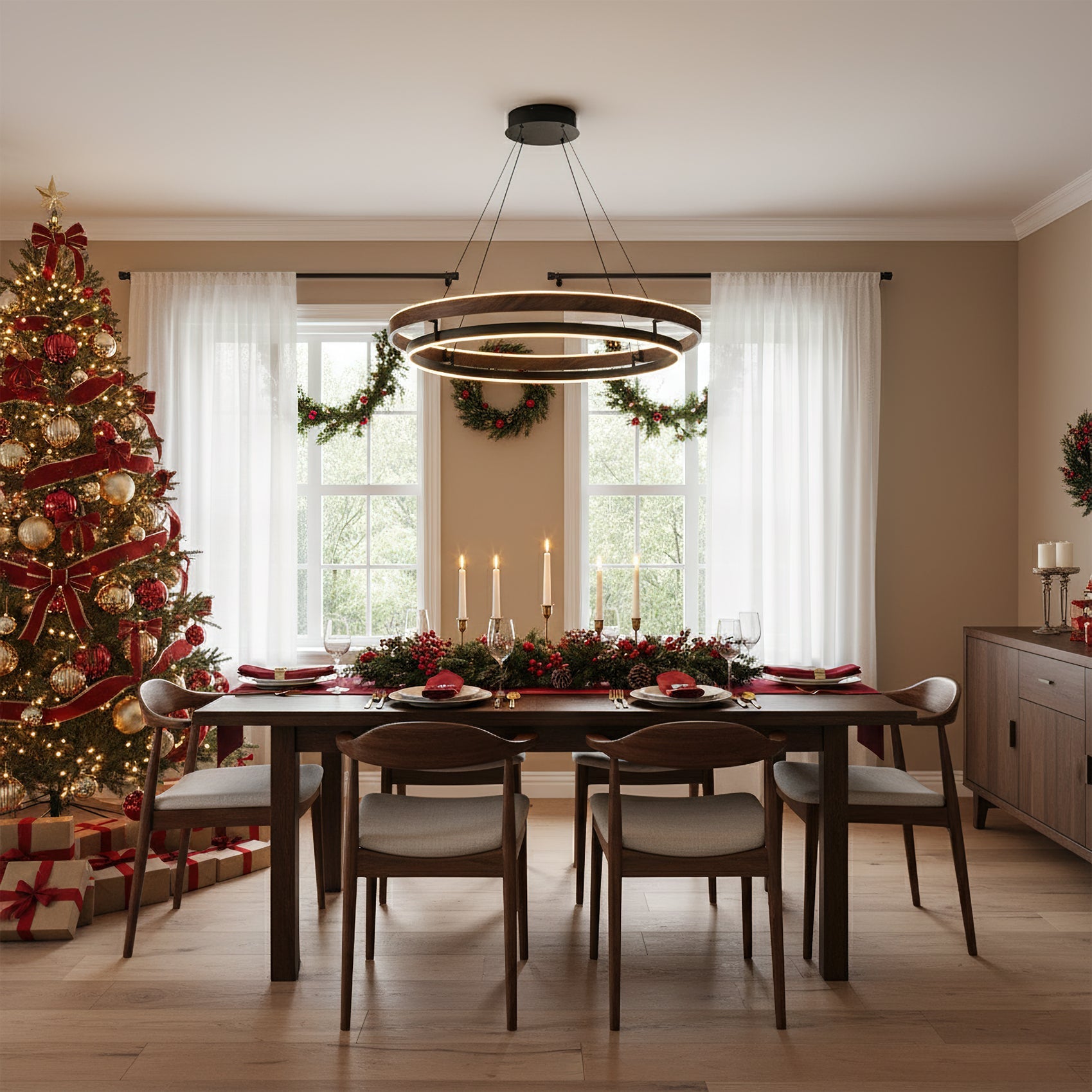 The Niseko Chandelier by dekorfine brings sculptural elegance to modern interiors with its sleek double-ring design and warm LED illumination. Crafted from durable metal with a rich wood-effect finish. this fixture creates a floating halo of ambient light€”perfect for dining rooms. living areas. or open loft spaces.