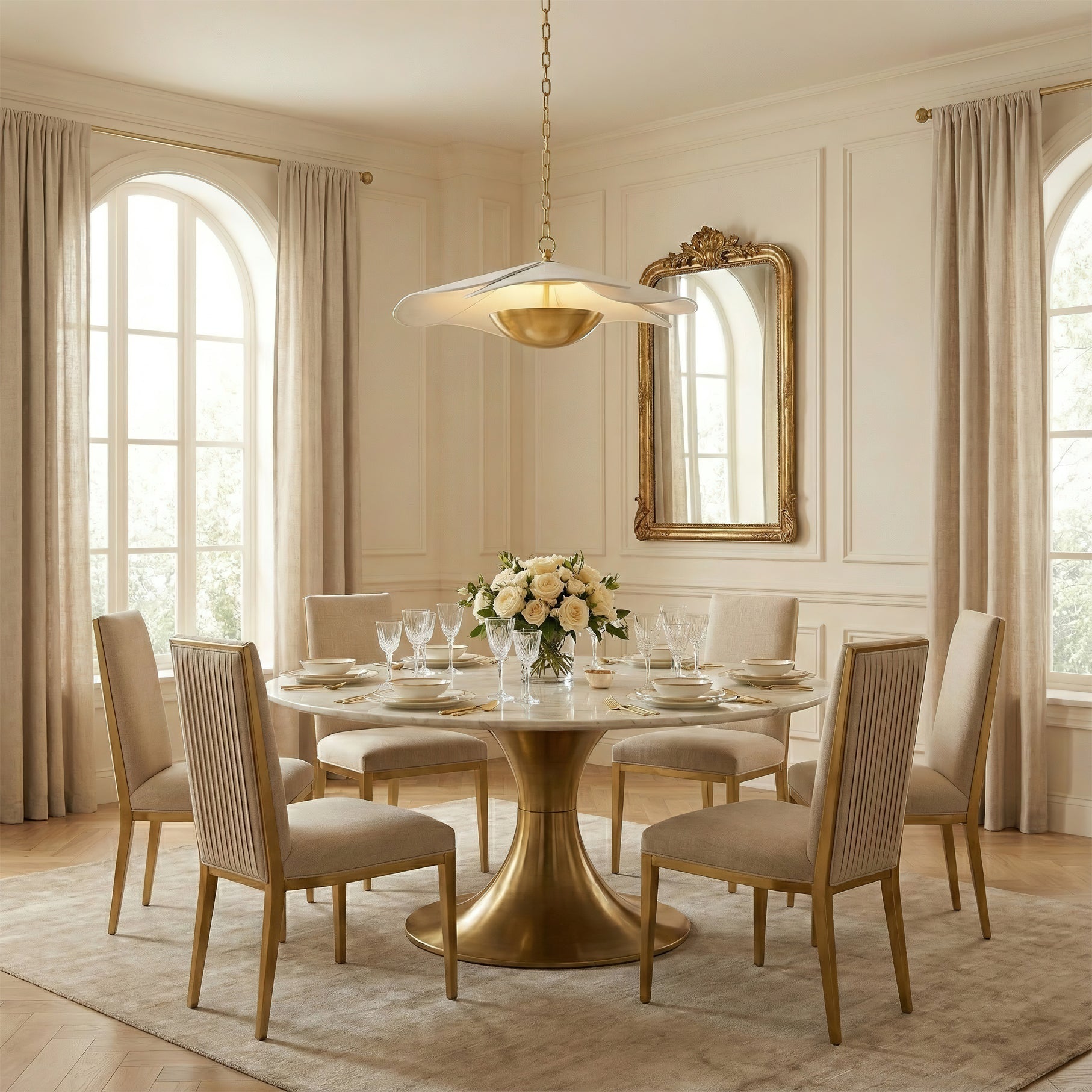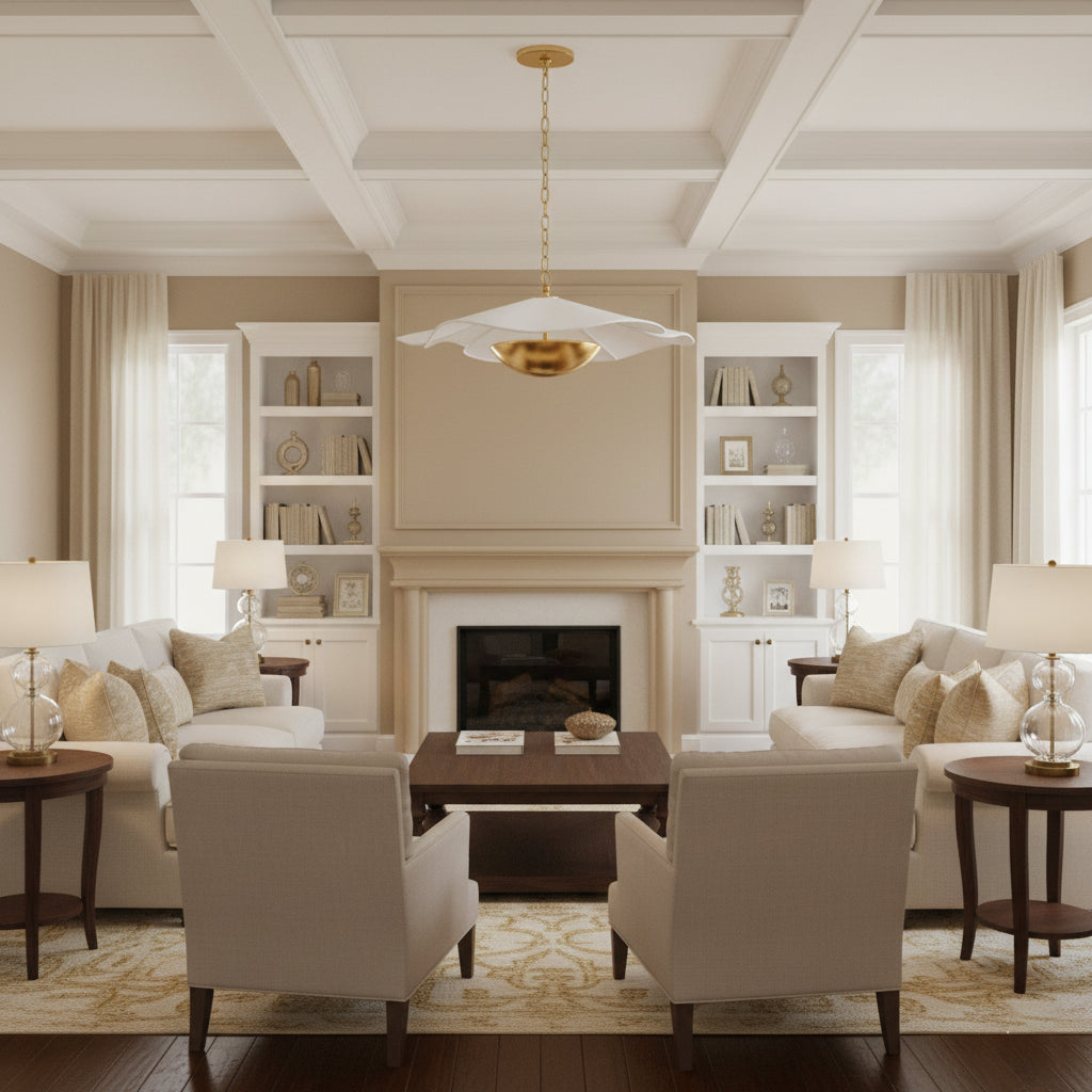 The Ressi Pendant Light offers a fresh. modern update to traditional factory lighting. perfectly balancing simple geometric shapes with a thoughtful mix of materials. This elegant fixture features a softly cascading white shade paired with warm metal accents. making it an inviting centerpiece for any dining room. kitchen island. or entryway.