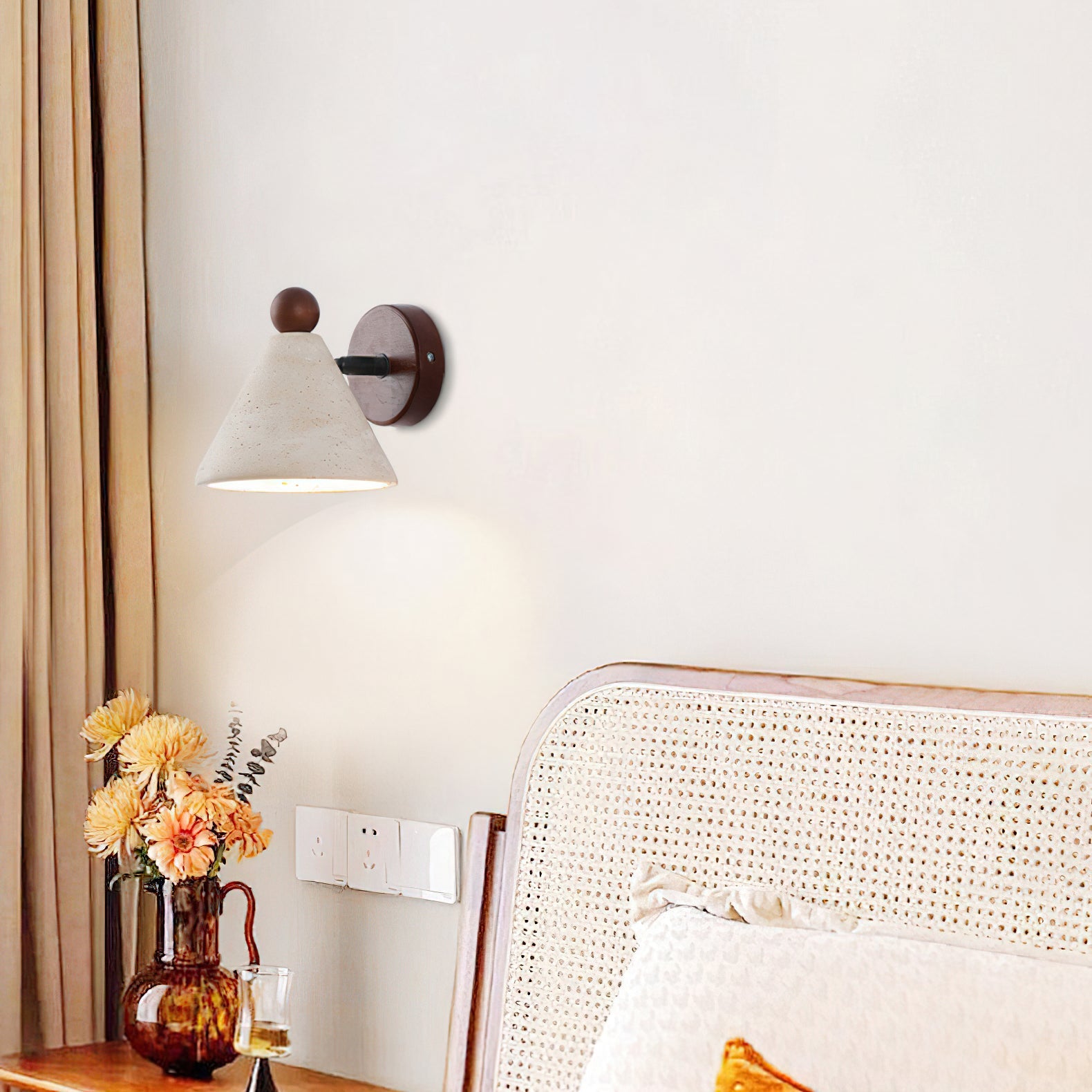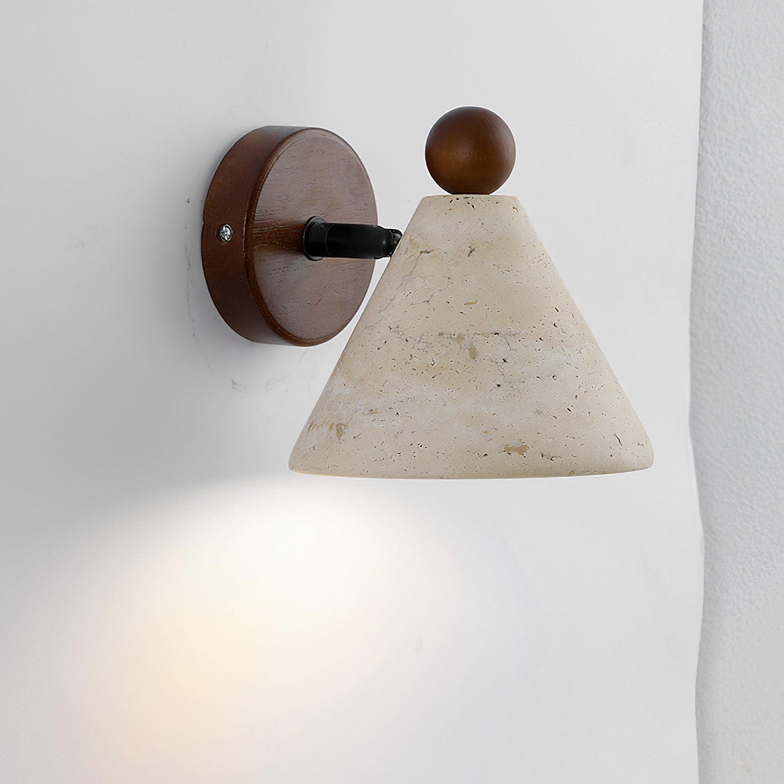 The Serax Wall Light moves away from cold industrial metals to embrace the warmth of the earth. The cone-shaped shade is made from Travertine. a limestone formed by mineral springs. giving it a distinctively 'imperfect' surface that adds depth and character to any room.