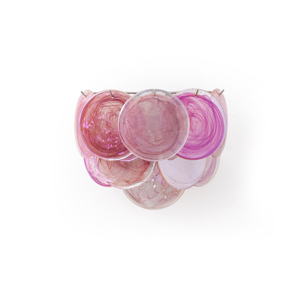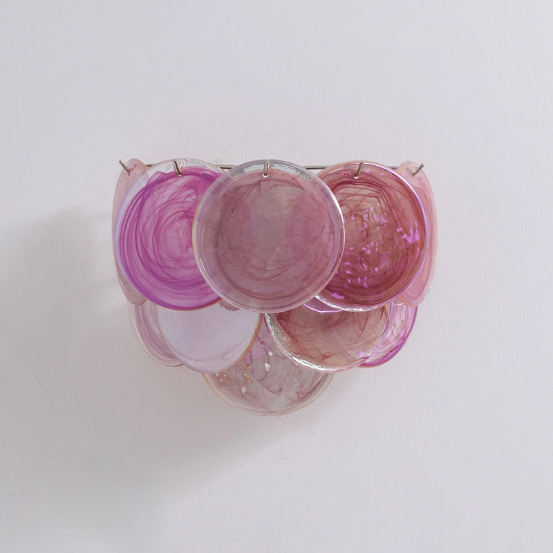 The Vistosi Disc Wall Lamp dekorfine captures the essence of vintage Italian design with its handcrafted glass discs in soft pink tones. Each disc is uniquely swirled with translucent patterns. creating a dreamy play of light and shadow when illuminated. Its layered composition brings texture and artistry to the wall. making it both a decorative piece and a functional light source.