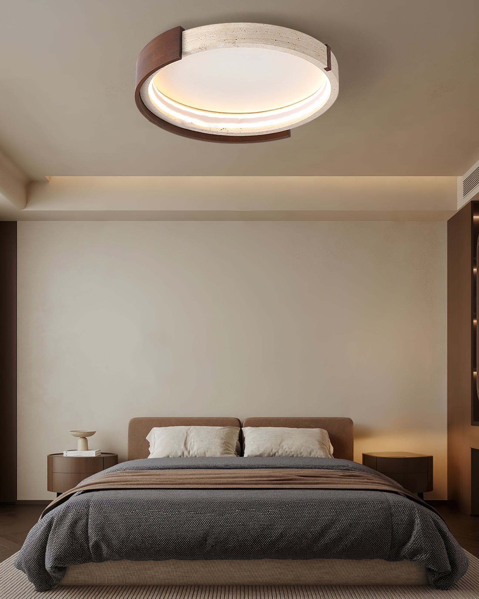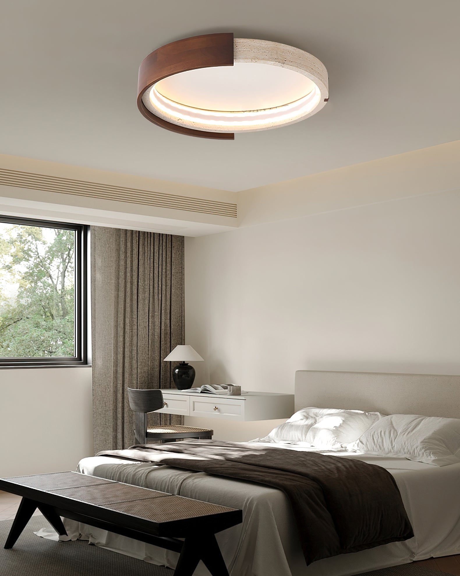 The Zenova Ceiling Light dekorfine blends the timeless beauty of travertine with the warmth of natural wood. creating a refined balance of elegance and modernity.